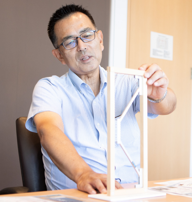 【鈴木】「ブレースリー」は2tの力がかからないと動き始めませんので、実際にどんな風に働くのか、見てもらうことが難しいんです。いくらイラストやチラシで説明しても、伝わりませんよね。 そこで、お客様に実際に「ブレースリー」の仕組みを見ていただくため、できるだけ忠実に、揺らしたときの動きも形状も本物に似せて作ってもらったんです。