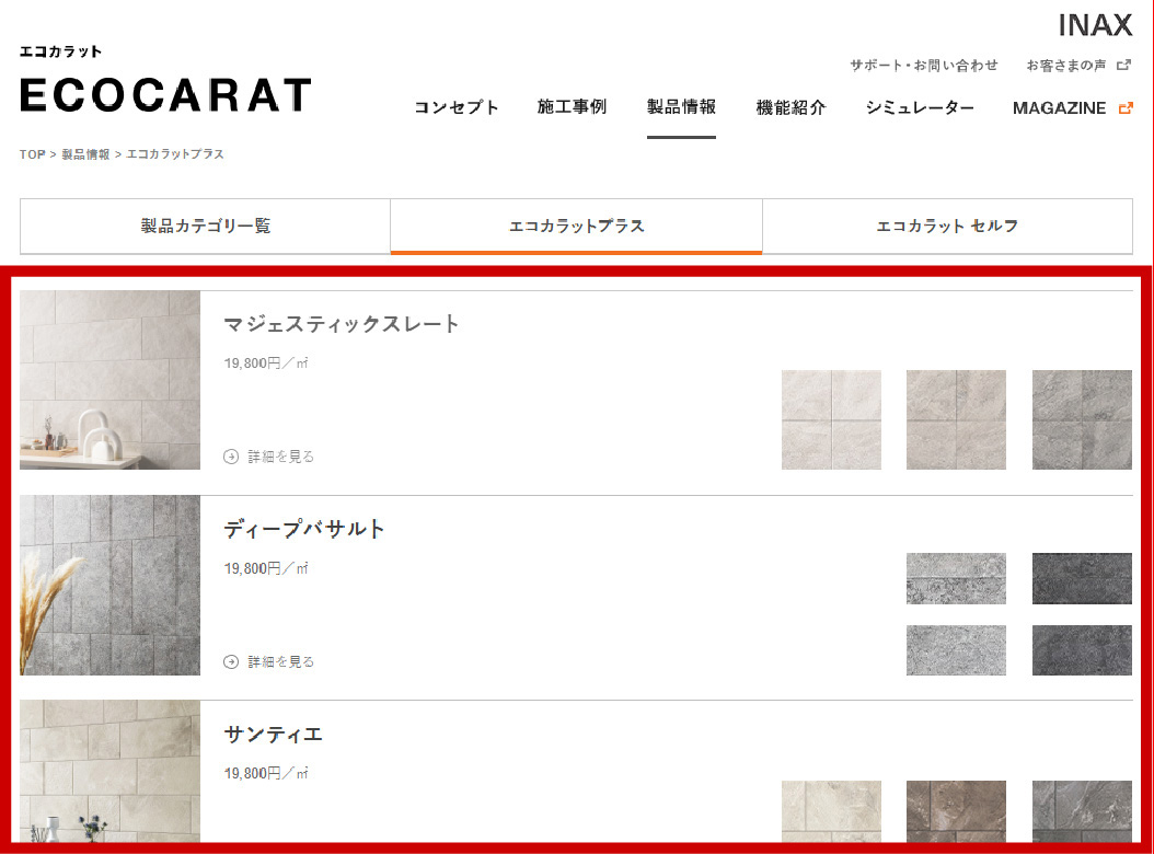 カラー&テクスチャーのサイトを見ていただければ、実物のエコカラットがどんなタイルなのか、また実際に壁に張ったときにどんな印象なのか、リアルに見ていただけます。カラーバリエーションも確認できるので、事前にあたりを付けるのにも便利です。