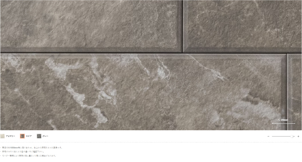 実際にショールームにご来店いただいても、カットサンプルは300×300mm。一方、カラー&テクスチャーサイトの画像は、1818×1818mmで張った状態を見ていただけるので、カットサンプルを見るよりも、実物に近い感覚で見ていただけるかと思います。